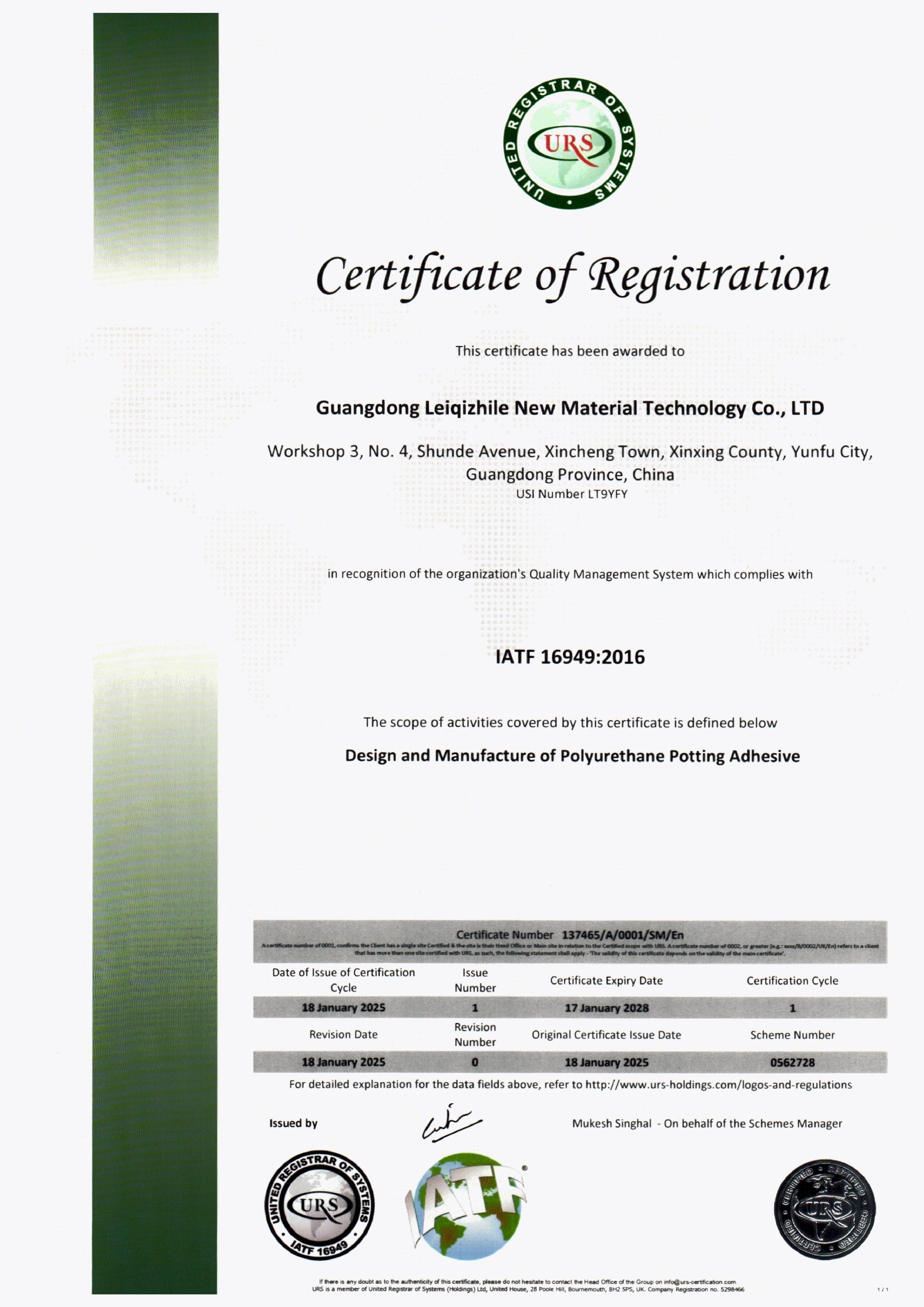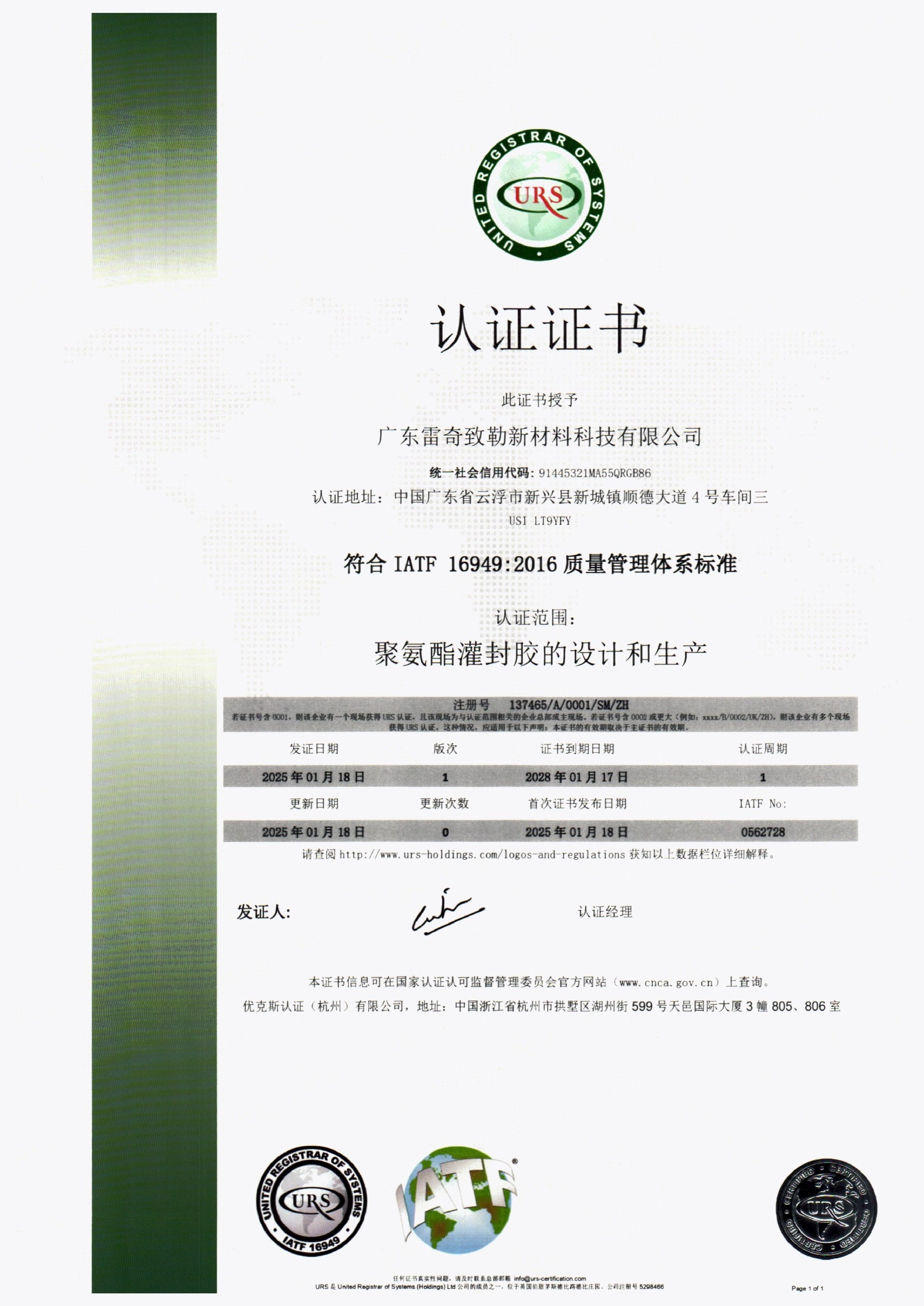 廣東雷奇致勒新材料科技有限公司獲得IATF1649認(rèn)證證書(shū)